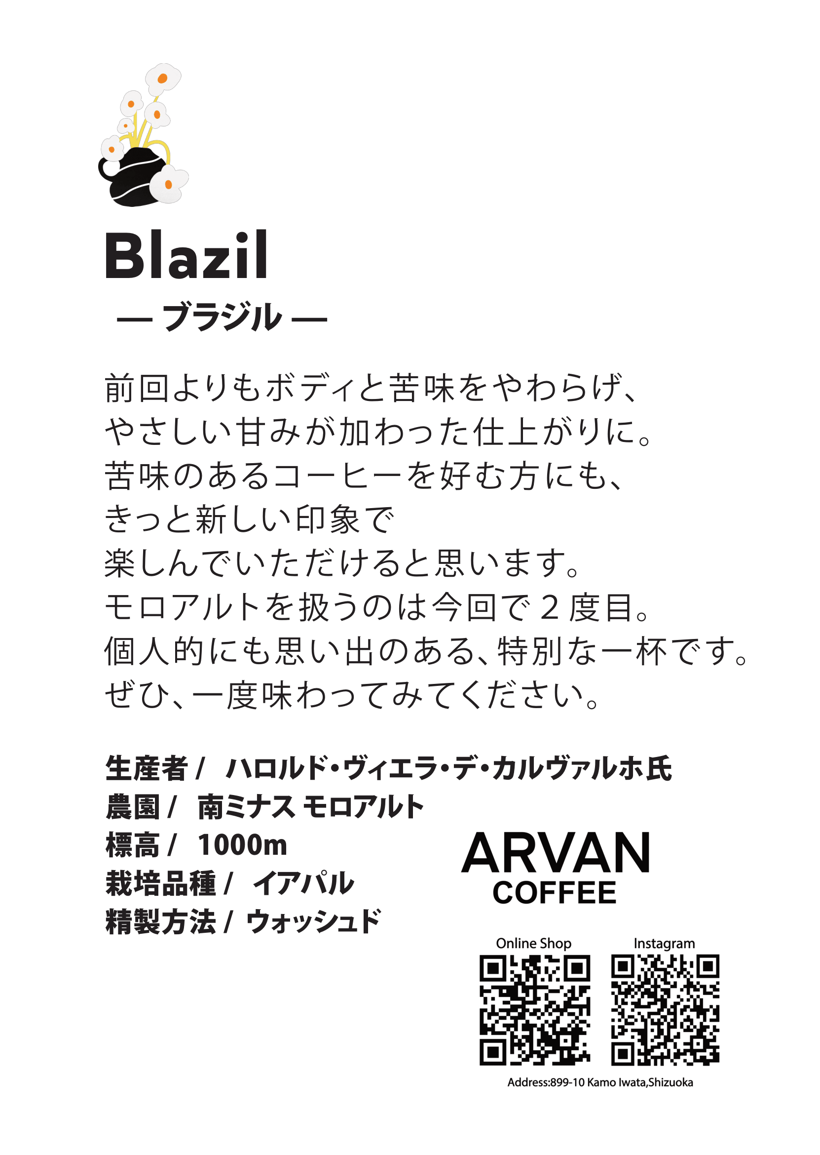 前回よりもボディと苦味をやわらげ、優しい甘味が加わった仕上がりに。苦味のあるコーヒーを好む方にも、新しい印象で楽しんで頂けると思います。モロアルトを扱うのは2度目。個人的にも思い出のある、特別なコーヒーです。ぜひ、一度味わってみてください。