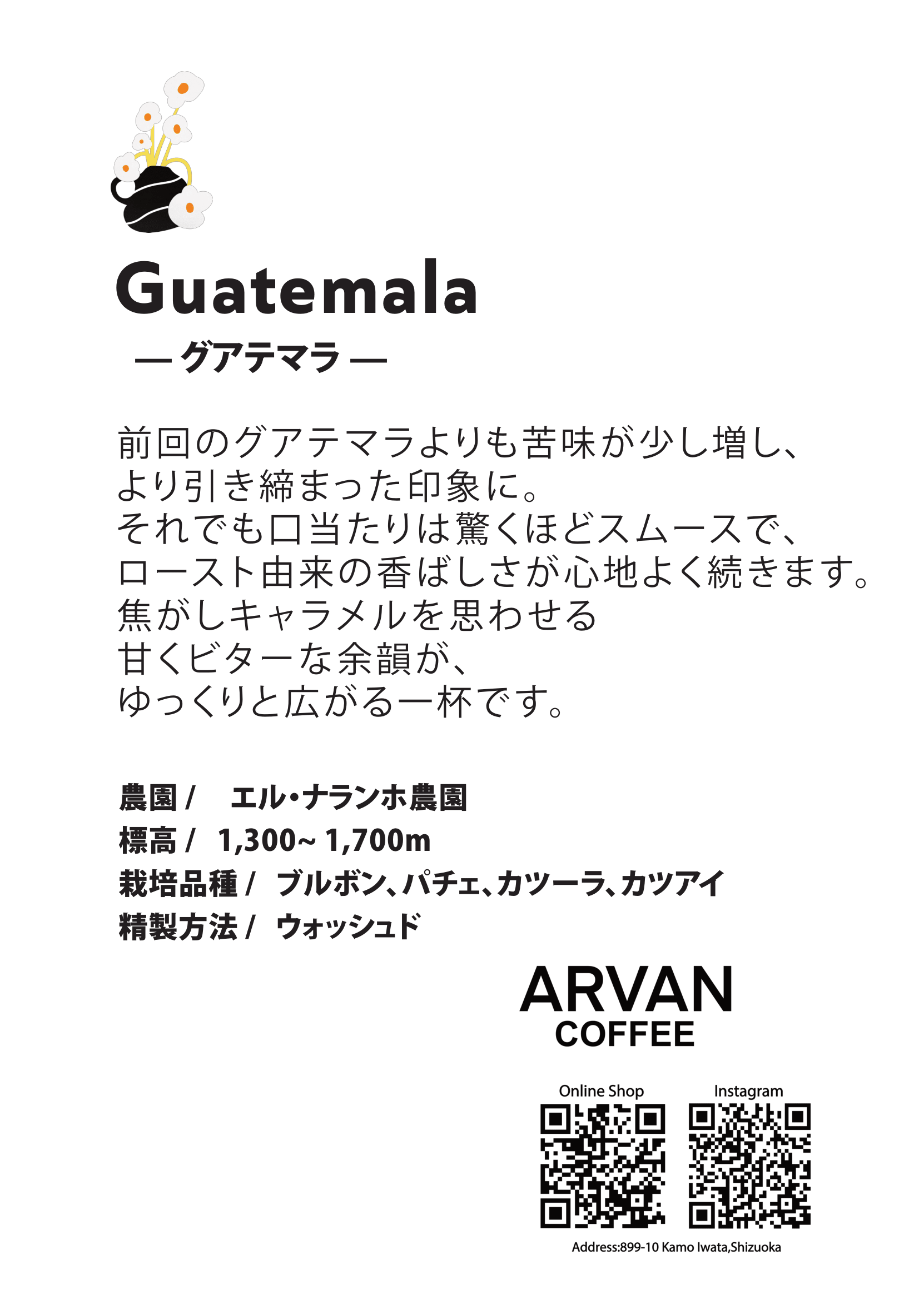 前回のグアテマラよりも苦味が少し増し、より引き締まった印象に。それでも口当たりはスムースで、ロースト由来の香ばしさが心地良く続きます。焦がしキャラメルを思わせる甘くビターな余韻が、ゆっくりと広がる一杯です。